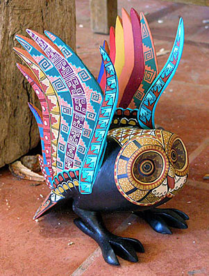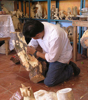 Jacobo is truly a master carver and painter, working in a style quite different from anything else we have seen. He gives us a half hour demonstration of the carving and painting process while another visitor kindly translates his narration into English. Jacobo does not need to draw on the wood in order to carve it, but for us he draws a coyote so we can see the figure in the wood as he does.