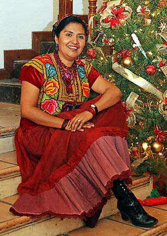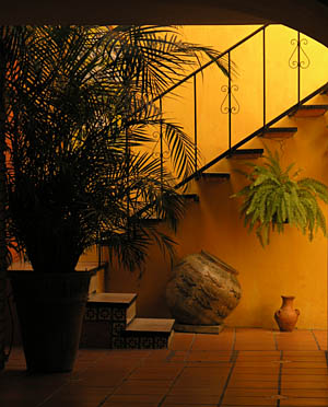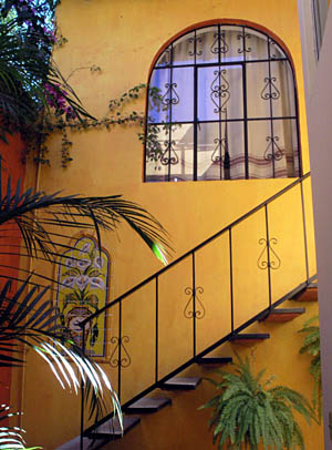 19 December Mis Recuerdos is Nora's original family home, and while you are a guest there, you very much feel that the family has opened their home to you. Breakfast is from 8 to 9, served in the dining room which is filled with rich colors and local crafts. Every morning we will discover the tables laid with another eye-pleasing set of placemats and linens, and Nora herself a vision of ethnic Mexico. Each morning there is fresh-squeezed juice and an assortment of Mexican breads, along with a small individual plate of fresh fruit. And each morning Nora cooks a different little specialty. She never repeats herself in the eight breakfasts we enjoy at Mis Recuerdos. Scaled down versions of tamales and flautas, omelets with homemade salsa -- all of it delicious. David will later say that one of his favorite things about the entire trip was Nora's breakfasts. |